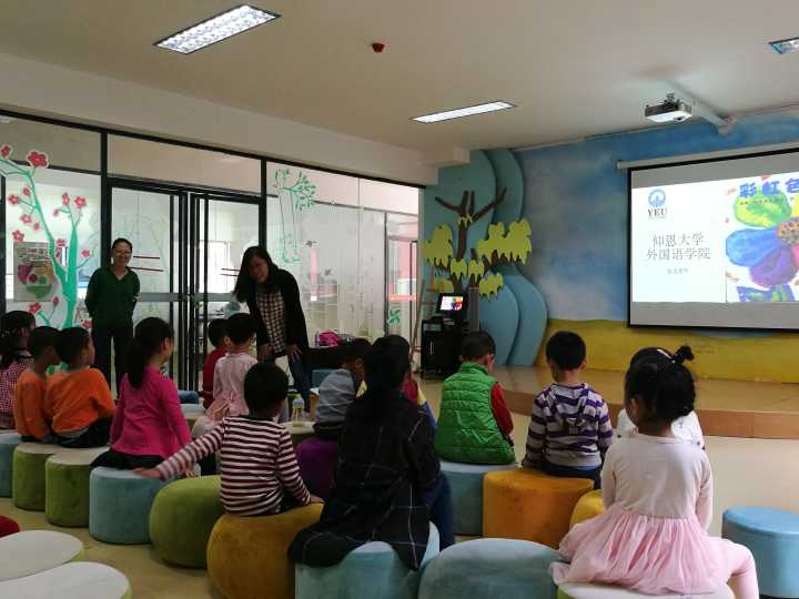 黄安然老师讲绘本现场 本次绘本讲读包含中文和英文两部分,绘本内容符合了4-7岁小朋友的接受范围。中文绘本题为《彩虹色的花》,由张玉老师进行讲读;英文绘本题为《We're Going on a Bear Hunt》该部分则由黄安然老师进行讲读。活动现场气氛活跃,生动的讲解充分吸引了小朋友的注意力并调动了他们的积极性。