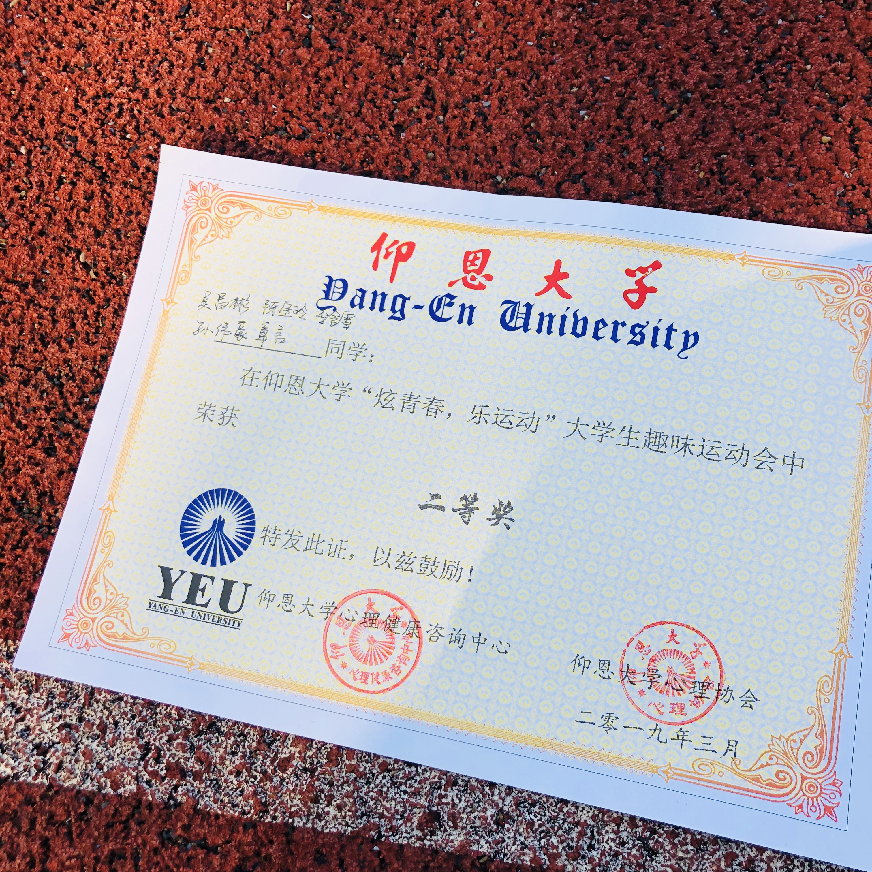 2018英语1班参赛获奖证书 比赛中,选手们充分利用道具,想方设法节省时间,你追我赶。其中“冰凌雪燕好”队在摸黑过林中用时最短,2.57秒便完成了比赛,在12支队伍中取得了第一名的单项成绩,在最终的综合成绩中,也取得了第二名的好成绩,获得了本次趣味运动会的二等奖。