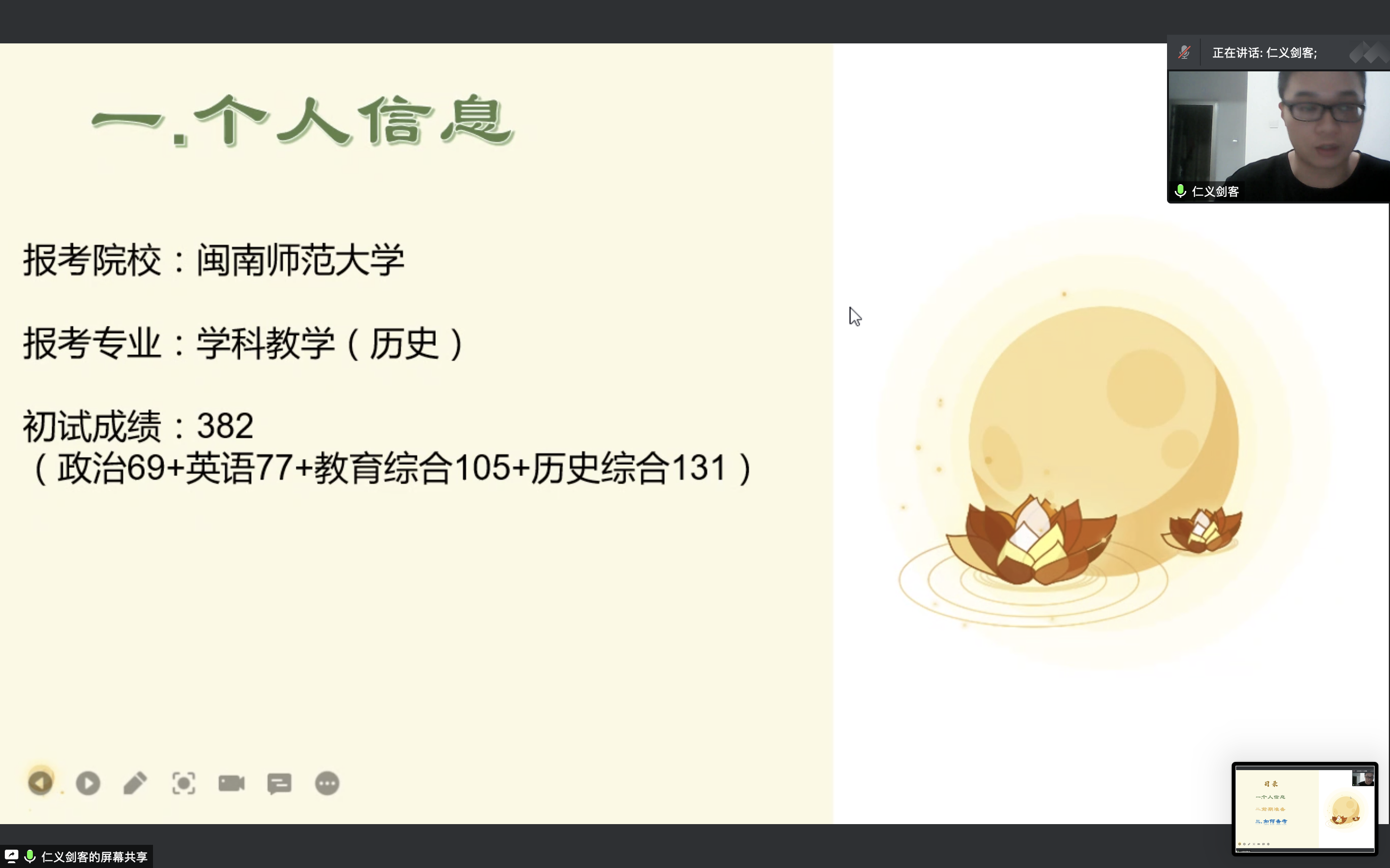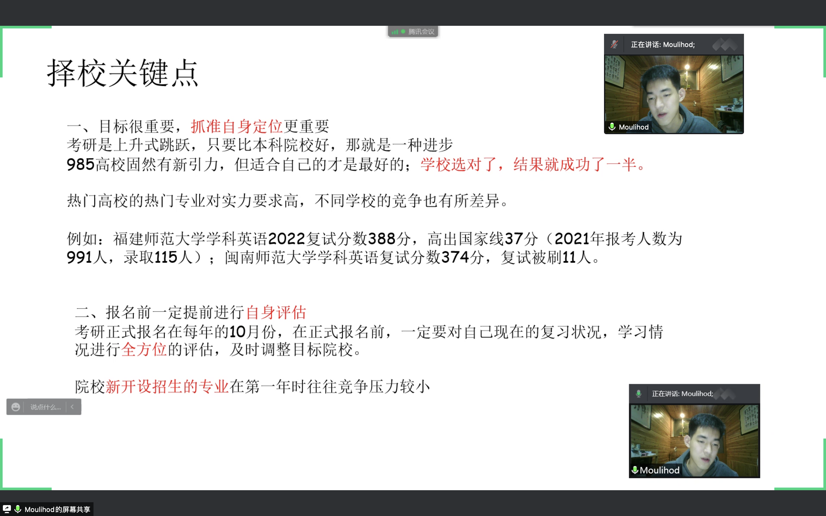 章言同学分享 章言同学首先进行经验分享。他结合自身的经历,从考研动机、选择学校和专业、备考学习计划和心理调试等方面传授经验。他着重强调,寻找一个志同道合的研友在考研过程中至关重要,同时建议大家劳逸结合,做到努力学习和身体健康两不误。