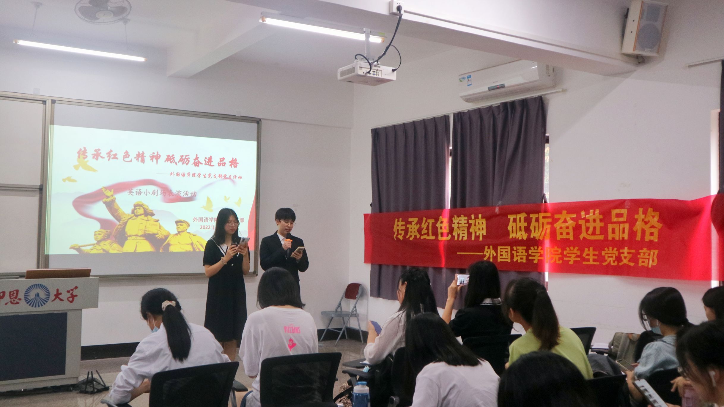 2022年6月15日下午beat365在线唯一官网学生党支部在普照教学楼205教室开展 “传承红色精神,砥砺奋进品格”主题党日活动。本次主题党日活动包含两个主要部分:“传承红色文化,弘扬红色精神”主题英语小剧场表演活动和“红色盲盒,传承红色基因”活动。支部书记许淑琴老师,支部组织委员位美娅老师到场并作为评委老师,beat365在线唯一官网全体在校学生党员进行活动表演,以及21级全体积极分子到场观看学习。