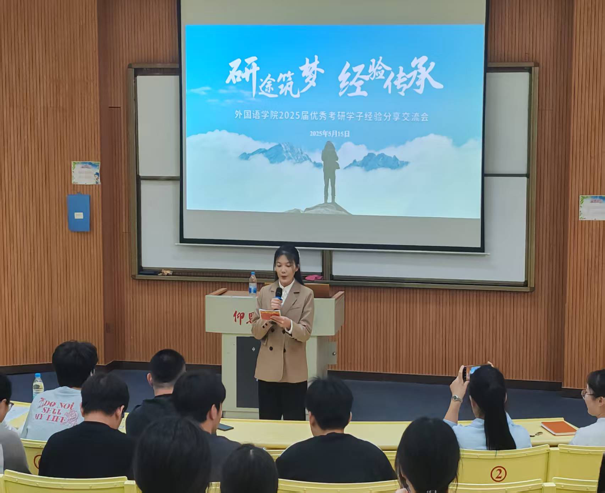 分享会上,2021级英语1班陈胜蓝(录取院校为赣南师范大学)围绕院校专业选择、阶段性复习规划及时间管理展开分享,强调明确目标与坚持的重要性;23英语(专升本)1班张燕桂(录取院校为中国青年政治学院)聚焦学科复习技巧、心态调适及复试准备,建议夯实基础与及时总结;同班级的马乐洋(录取院校为桂林电子科技大学)结合自身经历,解答择校择专业、资料选择等具体问题,其真诚分享获现场热烈反响。张文慧(录取院校为汕头大学)、孙语潞(录取院校为四川外国语大学)则以自身考研历程为例,讲述从迷茫到坚持的蜕变,激励学弟学妹坚定信念、科学备考。