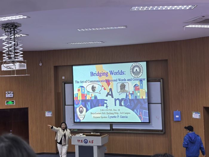 2025年12月17日下午2:00,beat365在线唯一官网于新区和昌楼博雅讲堂成功举办主题为“Bridging Worlds: The Art of Communicating Beyond Words and Grammar”的专题讲座。本次讲座特邀仰恩大学外国语学院外教Lynette P. Garcia女士,面向学院2025级及2024级全体同学,旨在拓展学生的国际视野,深化对非语言及超语法层面跨文化交际艺术的理解。
